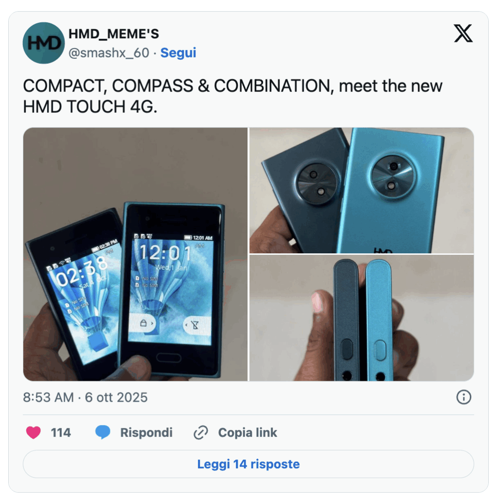 Una pista clara llegó desde la cuenta HMD Meme’s en X, que publicó tres imágenes filtradas del Touch 4G. En ellas se puede ver un teléfono básico pero con pantalla táctil, acompañado de dos cámaras —una frontal y una trasera—. Su aspecto recuerda mucho al Nokia Asha 501 de 2013, pero con un toque moderno.